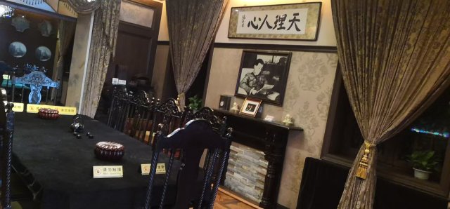 专门接待外国人的西式接待室,少帅在这边接待过很多的名人政要。进入房间,“天理人心”这幅字是当年少帅专门找人仿写的父亲张作霖的字,沈阳大帅府的大青楼建成后,张作霖命人将自己亲笔题写的“天理人心”四个大字刻在楼前的假山石壁上方,以使自己每天进院抬头就能看见这四个字。